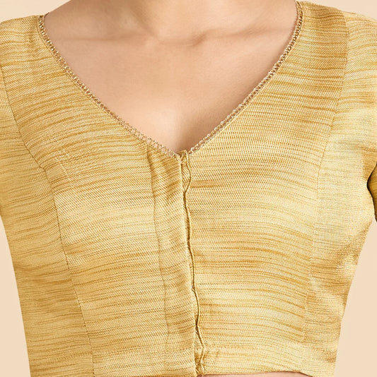 Women’s Green Cotton Silk V-Neck Readymade Saree Blouse with Gold Buttas | Elbow Sleeve