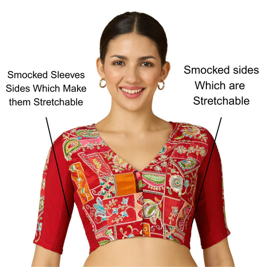 Women’s Red Viscose Crepe Embroidered Stretchable (Smocked) Saree Blouse | Festive Readymade Blouse