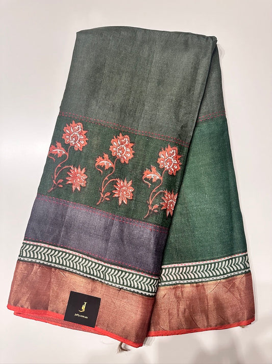 Bottle Green Pure Silk Saree with Golden Rangoli Motif – Elegant Handloom Silk with Blouse